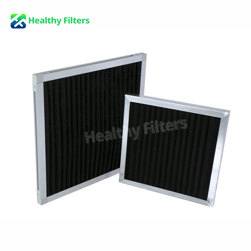 Pleated carbon filters are an effective way to remove and prevent odors and fumes, and are widely used in air conditioners. The activated carbon materials are folded and supported by paperboard sheets, metal meshes, or other materials to maintain a rigid structure. The pleated carbon filter is then surrounded by a firm frame made of paperboard, foam, aluminum alloy, or galvanized metal. This sturdy frame extends the service life of the pleated carbon filter and allows for easy installation on machines or air conditioners.