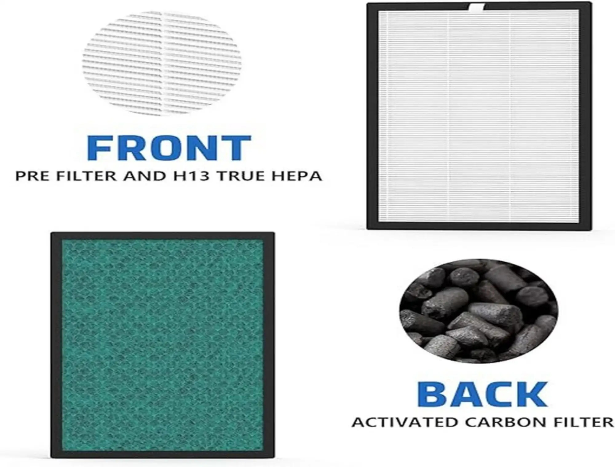 ● 3-STAGE FILTRATION: It includes a pre-filter to trap hair and large particles, a true HEPA filter to remove fine airborne particles, an activated carbon filter to remove odors and VOCs from the air. ● The H13 true HEPA filter, combined with the activated carbon filter, forms a powerful duo that effectively captures 99.97% of microscopic particles as small as 0.3 microns. This includes pollen, pet dander, and dust, significantly improving indoor air quality. ● The activated carbon filter activates the anion function to accelerate air purification by electrically charging the air to attract dust, odors, and pollen. The filter also helps absorb unwanted odors, including pet odors, cooking smells, smoke, and harmful VOCs. |